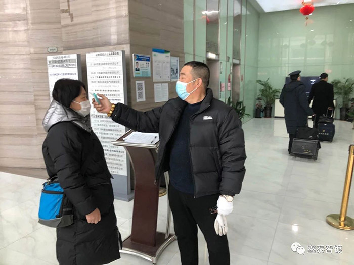 對于出入的鑫泰員工進行體溫二次測量,確保體溫準(zhǔn)確無誤。