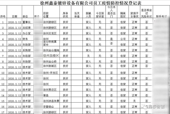 全面掌控公司及家屬疫情期間基本情況。于2月9日開始建立《鑫泰公司人員疫情基本情況登記表》,每天登記員工信息,特別是返廠前來源地、返徐或來徐時間、是否有湖北旅居史、返廠前前兩天體溫是否正常、是否有感冒、發(fā)燒、氣促狀況、返徐居住地等。重點關(guān)注6名外地復(fù)工人員,安排專人對其情況進行跟蹤,返徐后根據(jù)上級規(guī)定,進行居家隔離。