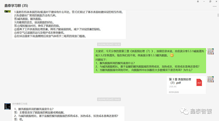 居家辦公期間不能忽視專業(yè)知識的學(xué)習(xí)?;谖⑿牌脚_建立學(xué)習(xí)群,由專人負(fù)責(zé)網(wǎng)上分享鍍鋅專業(yè)知識,并進行網(wǎng)上問答互動。